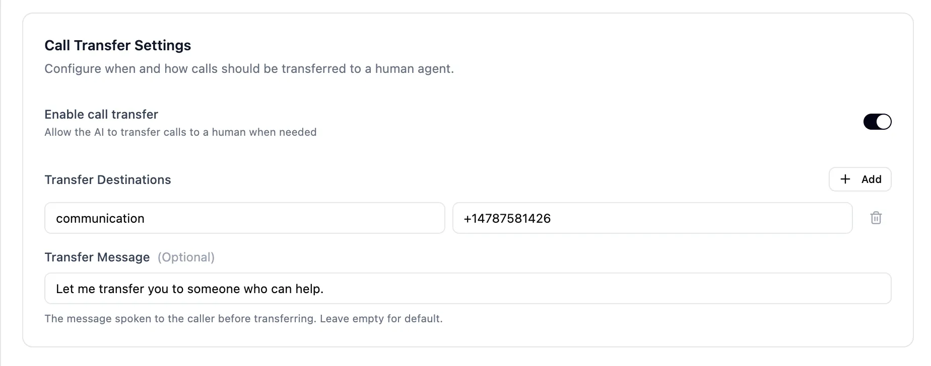 Custom Transfer Message: You have the option to set a specific message the AI speaks to the caller before the line is transferred (e.g., "Let me transfer you to someone who can help.").