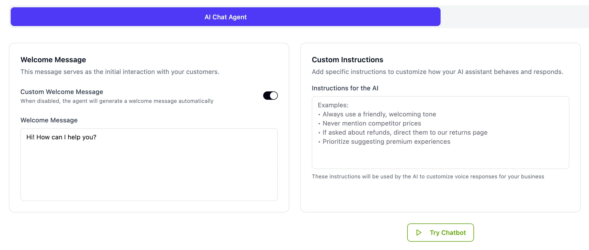Both your Chat Agent and Voice Agent pull from the same information. This ensures that a customer gets the same answer whether they ask over text or over the phone.
