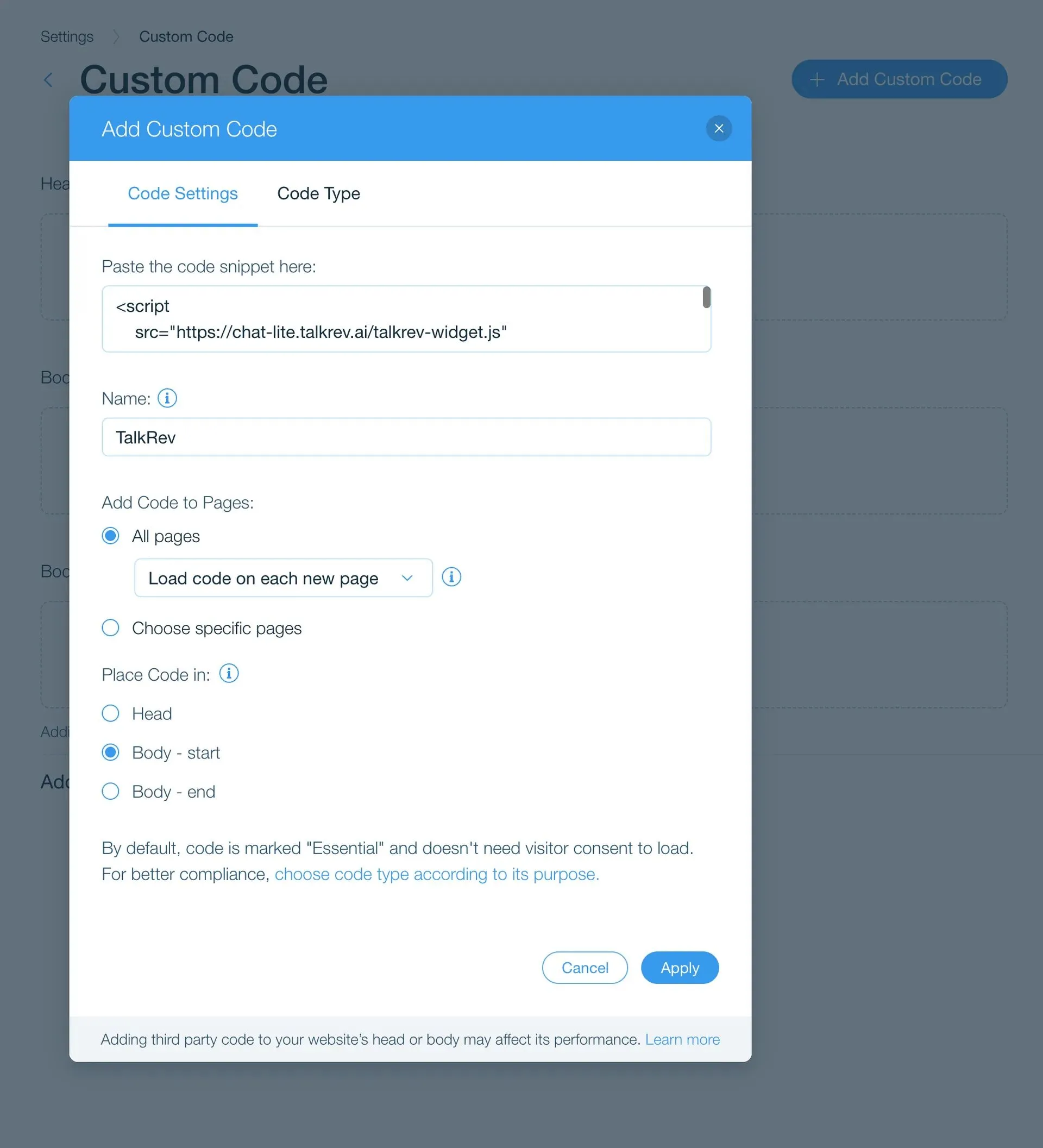 Widget Installation Code (example of adding a custom code in settings)
