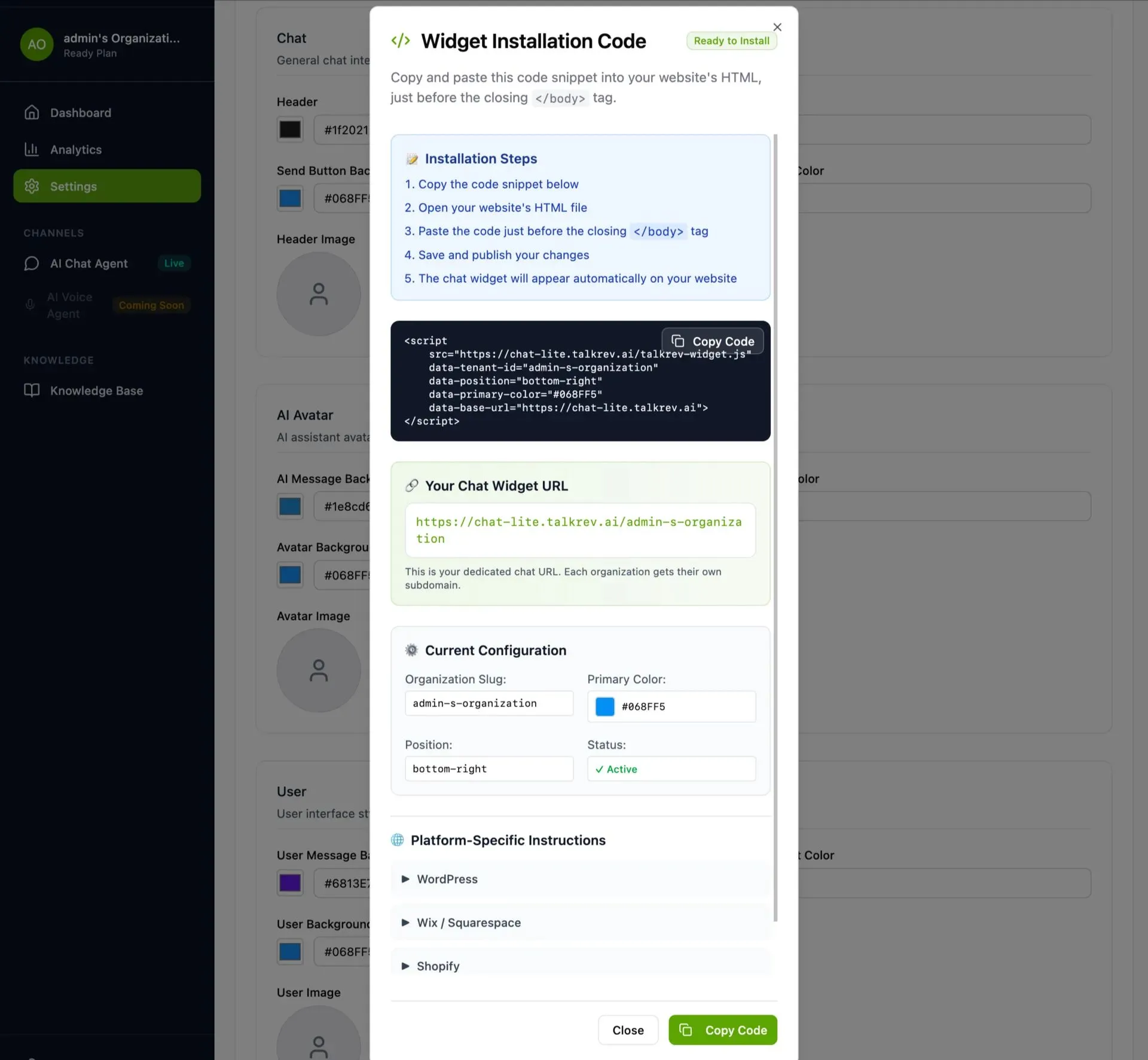For Chat: Copy the installation code and paste it into your site (WordPress, Shopify, Wix, etc.).